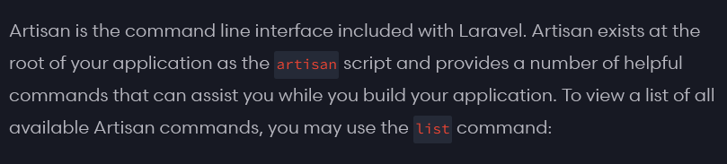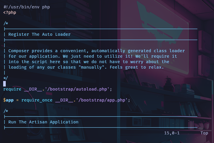 En la primera línea, se menciona que artisan es una interfaz de línea de comandos que se incluye con Laravel, un framework de PHP. Al abrir este archivo, encontramos código PHP, lo que significa que podríamos intentar ejecutar algún comando del sistema usando funciones de PHP como exec o shell_exec.