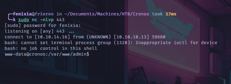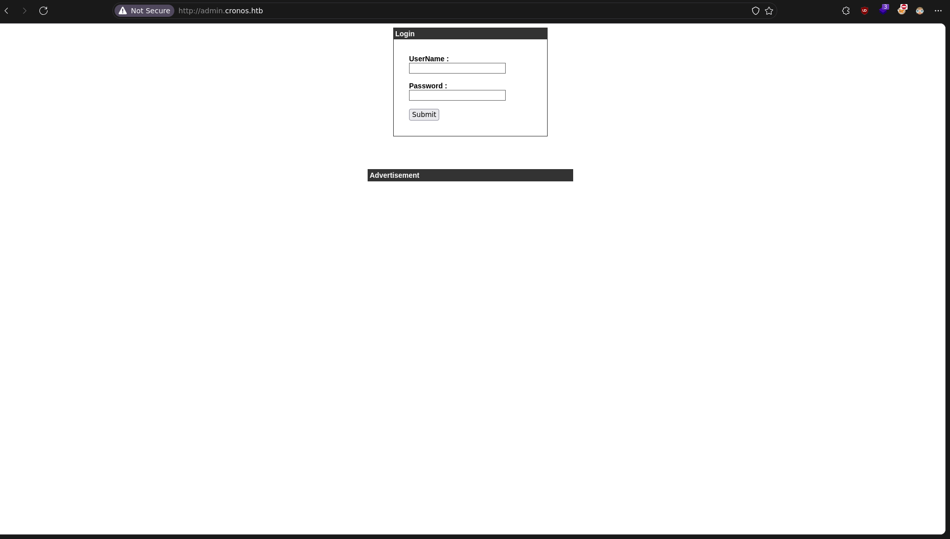 Nos devuelve 3 subdominios diferentes. De ellos, el que más me resulta interesante es admin.cronos.htb, ya que esto suele ser un portal de administración, lo cual es una mala práctica. Se recomienda revisar todos los subdominios, ya que este podría ser un rabbit hole.