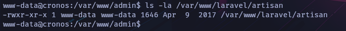 Vemos un proceso ejecutado bajo el UID 0, es decir, bajo el usuario root. Este proceso está ejecutando un archivo llamado artisan mediante PHP. Primero, veamos si tenemos permisos de lectura o escritura.