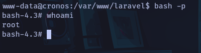 Con esta línea agregada, guardamos el archivo y, tras esperar un momento, ejecutamos bash -p para iniciar Bash en modo privilegiado, lo que nos permite mantener los privilegios SUID asignados al binario de Bash, si los tiene, sin importar el nivel del usuario.