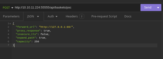 En el artículo del NIST mencionado anteriormente, encontramos un enlace externo sobre cómo realizar esta explotación: request-baskets SSRF details. El redactor del artículo utiliza la herramienta Postman, pero para peticiones web prefiero utilizar la herramienta Insomnia (esto es por simple cuestión de gustos, incluso pueden utilizar Burpsuite para esto).