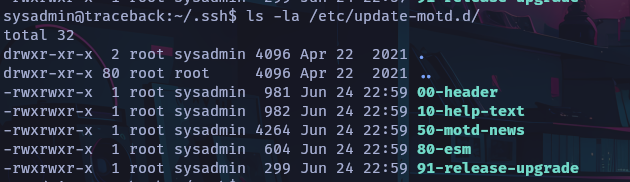 1 | /etc/update-motd.d/ is used to generate the dynamic message of the day (MOTD) that is displayed to users when they log in to the system. If we can modify files listed in the directory, we can inject malicious script to escalate privileges. |