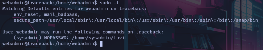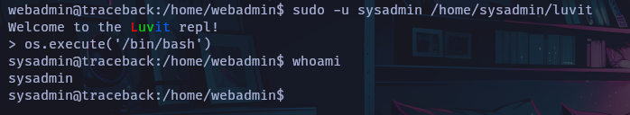 Podemos ejecutar una herramienta llamada luvit como el usuario “sysadmin” (justo lo que buscamos).