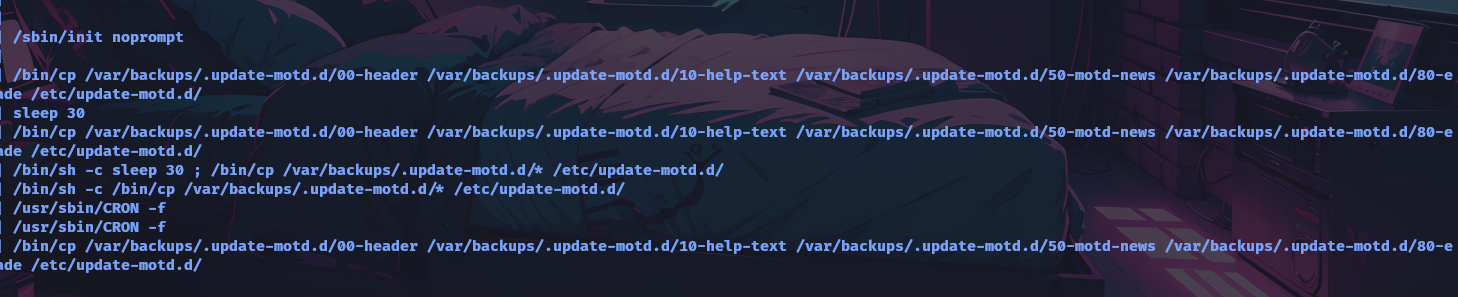 En este caso, podemos ver que hay un proceso que se ejecuta cada cierto tiempo, que copia los archivos de la carpeta /var/backups/.update-motd.d hacia la carpeta /etc/update-motd.d.