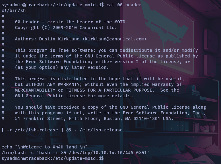 Ya que podemos realizar login por SSH, toca modificar el archivo 00-header para que se ejecute un script en bash para asi obtener la reverse shell al momento de logearnos por SSH.