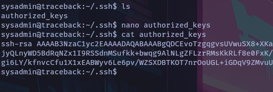 Para realizar esto, tenemos que tener nuestro archivo id_rsa.pub de nuestra maquina atacante y copiarlo dentro de la maquina victima en el archivo~/.ssh/autorized_keys lo que nos otorga el acceso por via ssh sin necesidad de conocer la contraseña del usuario.