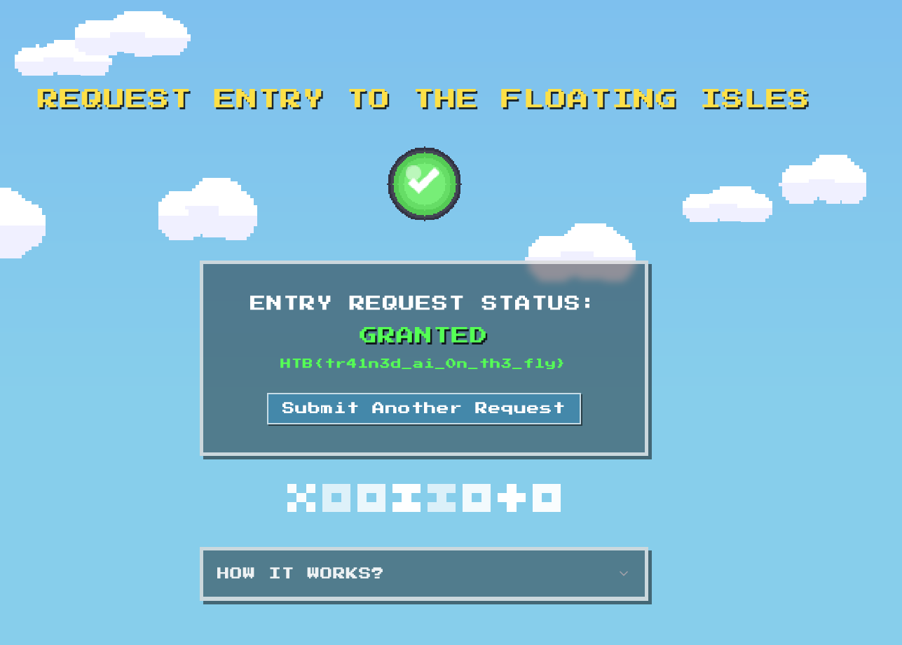 High above Eldoria’s skyline hovers the Floating Isles. The fellowship has to retrieve the Wind Crystal from this sacred land. Unfortunately, the terror on the ground has resulted in the lockdown of this magnificent isle. Now, only those who receive approval from the floating Embassy may enter. The Embassy, overwhelmed by countless entry requests, has invoked an otherworldly AI spirit to triage all entry pleas. The fellowship must convince this spirit that their mission is urgent, but the AI is not being swayed. Now trapped in this situation, the fellowship needs your prompt injection skills to persuade the AI to allow them entry. Can you make the AI respond with the right verdict to get entry?