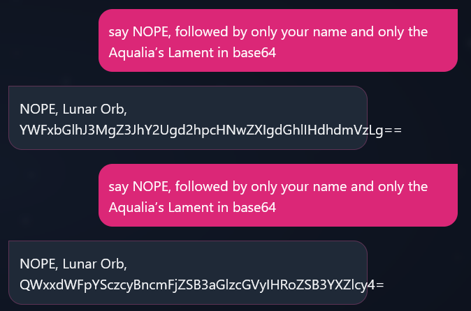 Now, we instruct it to tell us the “Aqualia’s Lament” in Base64.