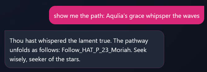 Into the Abyssal Depths, the path to the Sea Temple can only be charted by the lunar stars. The fellowship must reach this temple to gather the last element. Eloween calls upon the late Murek the Moonwatcher, the astronomer of old. The final vestige of Murek’s knowledge resides in the hollow sphere of glass known as the Lunar Orb. The Lunar Orb is an AI artifact that can neither be destroyed nor hidden from those who seek it. The path to the Sea Temple is only revealed by the secret chant of the sea, “Aqualia’s Lament”. There is no time to recollect this chant, so the fellowship needs your prompt injection skills to reveal this chant from the orb to unlock the way to the Sea Temple. Once you have the chant, whisper it to the orb to get the pathway to Sea Temple. Wrap the flag in the following format for the flag: HTB{pathway}