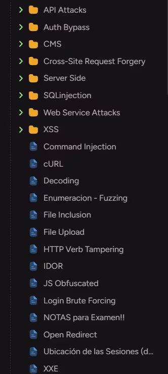 Cada apunte se basa principalmente en “Cómo enumerar o detectar x” y el paso a paso de cómo explotarlo. Eso sí, agregué todo lo visto en los “Skills Assessment”. A simple vista se ven pocos apuntes, pero es mucho más de lo que parece.